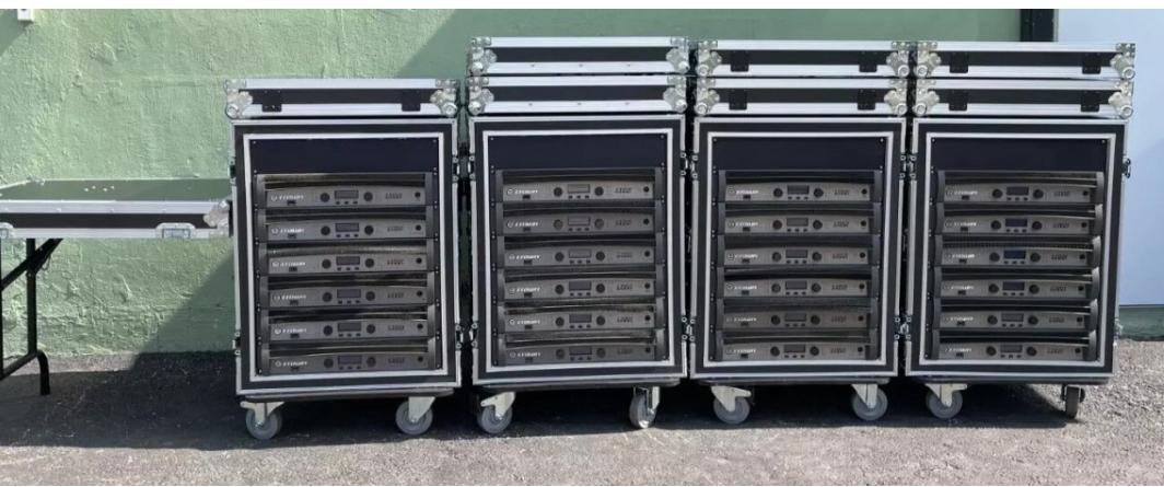Complete turnkey rack system featuring (6) Crown I-Tech 12000HD power amplifiers professionally installed with integrated speaker output panel and rack hardware. Fully tested and ready for high-performance audio amplification in touring, live events, and installed sound applications.