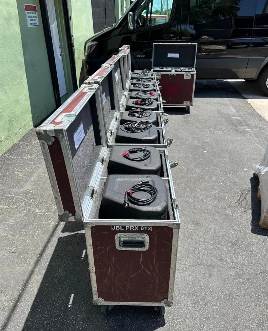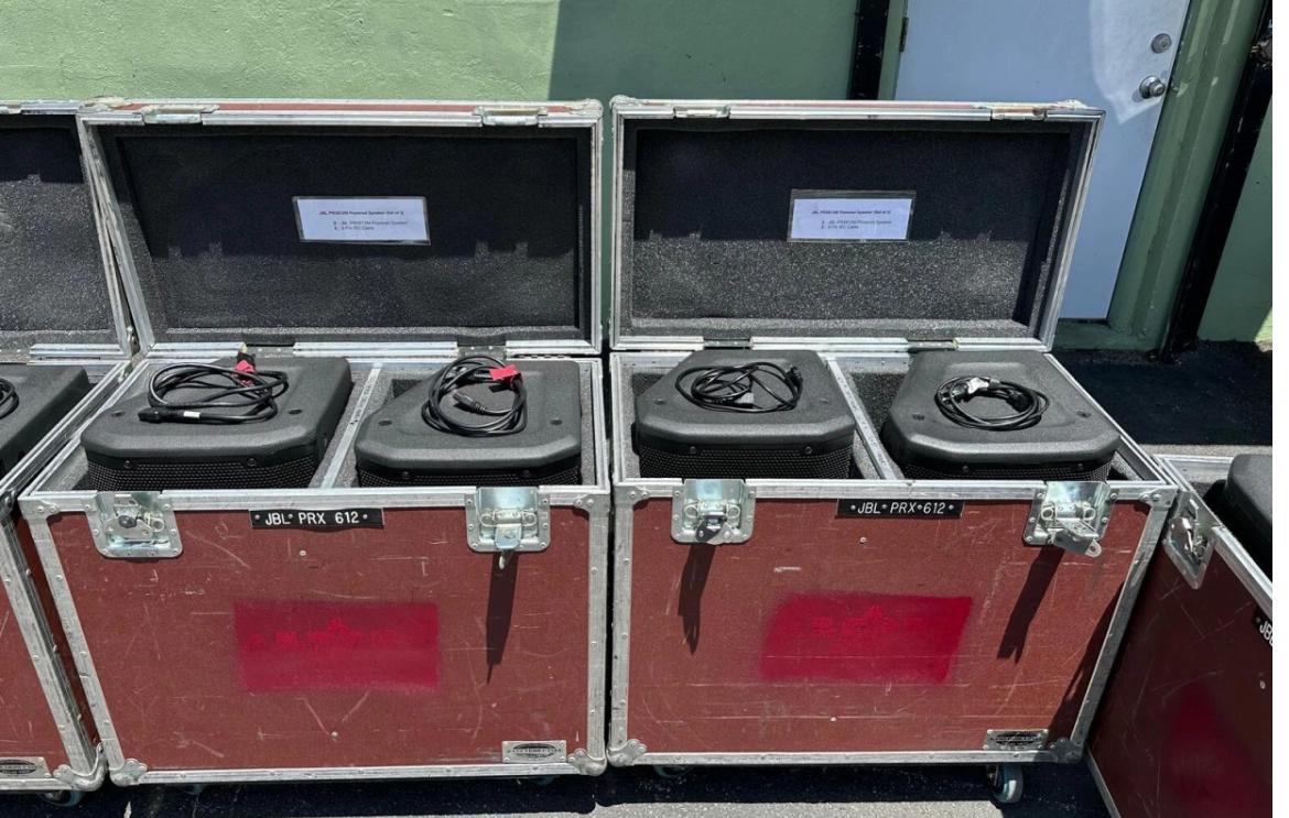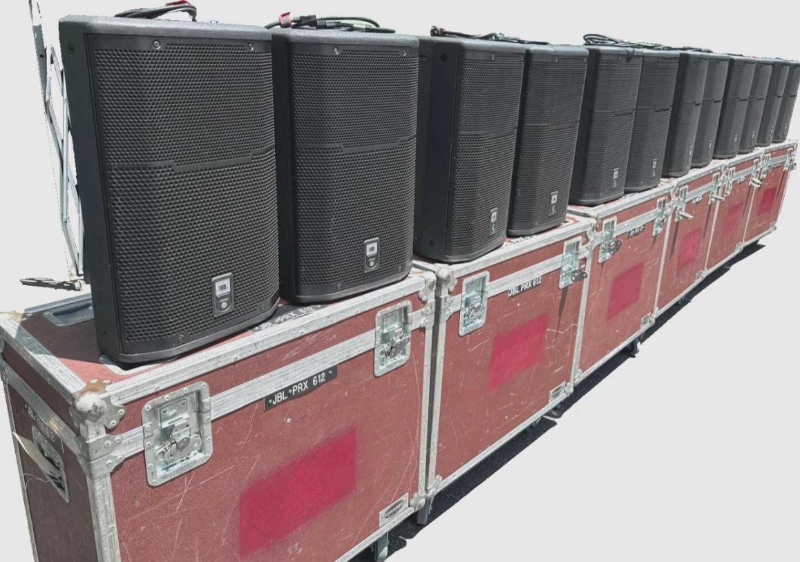 This listing includes two (2) JBL PRX612M powered speakers housed in a durable wheeled road case for safe and easy transport. These versatile 12” two-way speakers are ideal for live sound, monitors, and small PA systems.