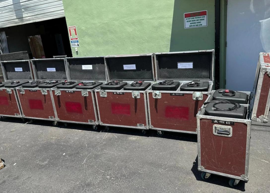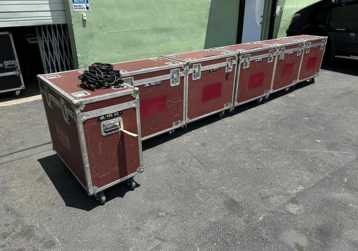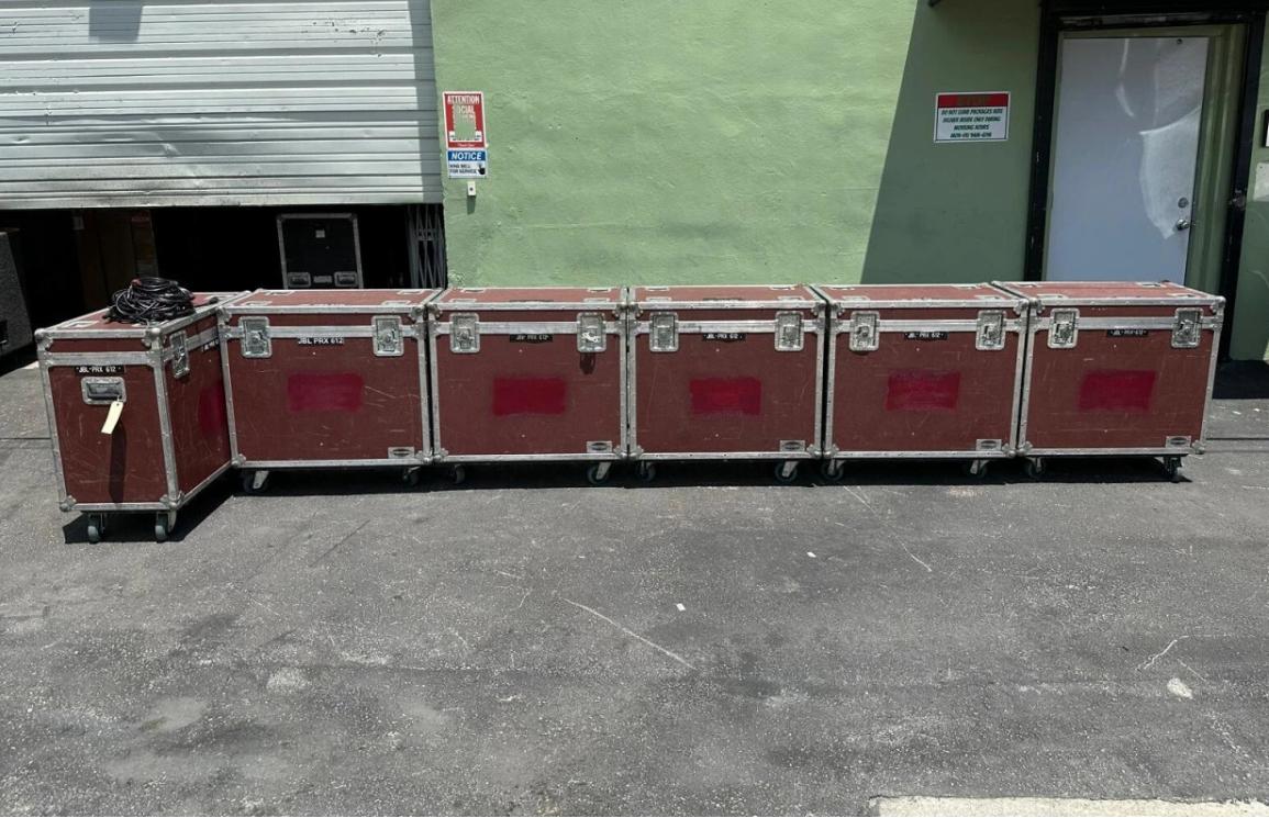 JBL PRX612M 12” Powered Speakers in Wheeled Road Case – Used
